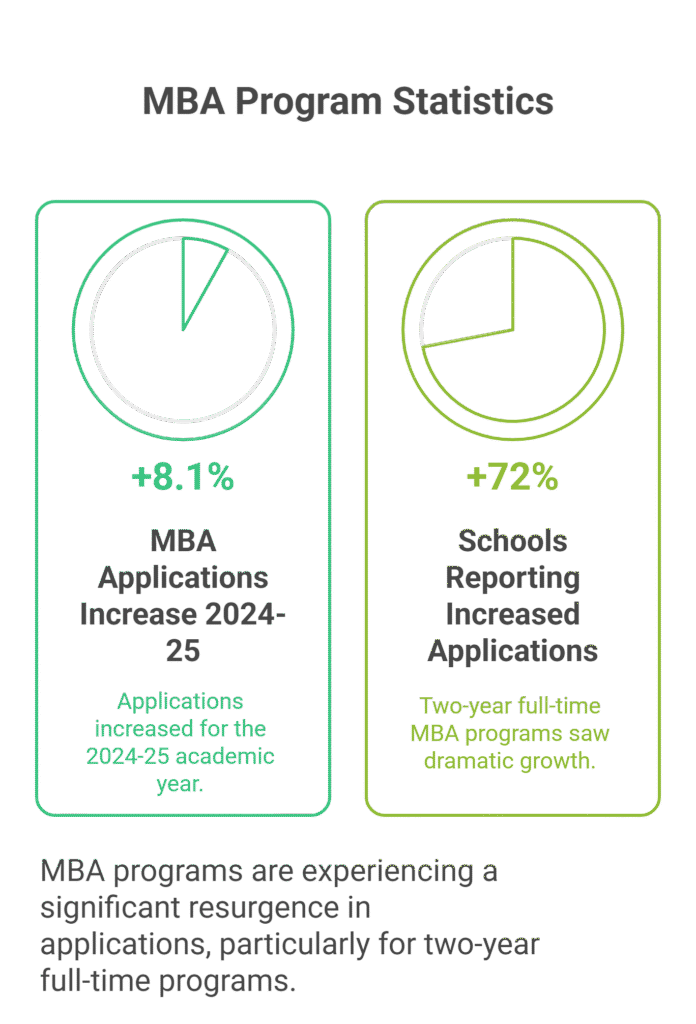Recent data reveals a remarkable resurgence in MBA applications. For the 2024-25 academic year, applications increased by 8.1%, with two-year full-time MBA programs experiencing the most dramatic growth—72% of schools reported increased applications (GMAC 2024 Application Trends). This represents a decade-high surge, surpassing even pandemic-era application boosts.